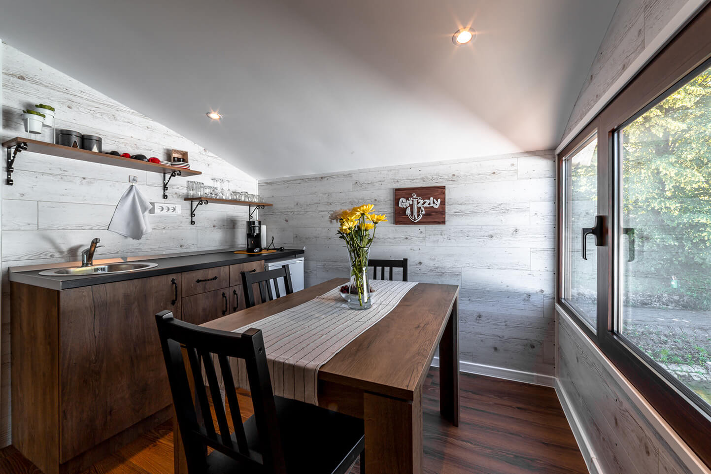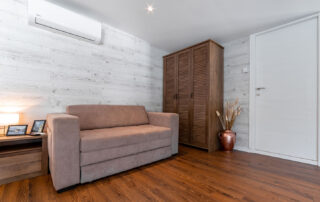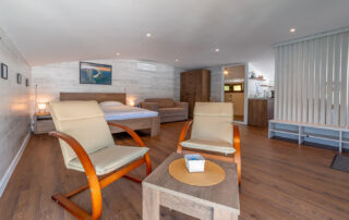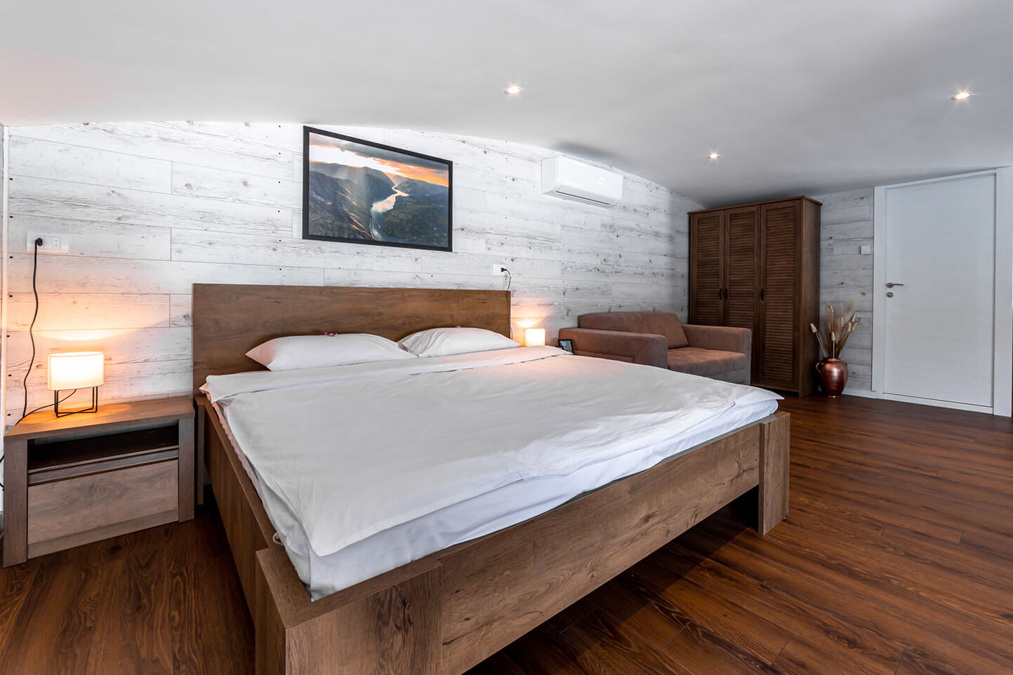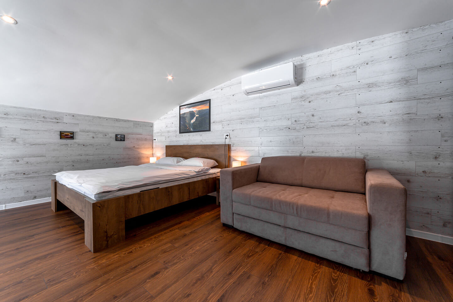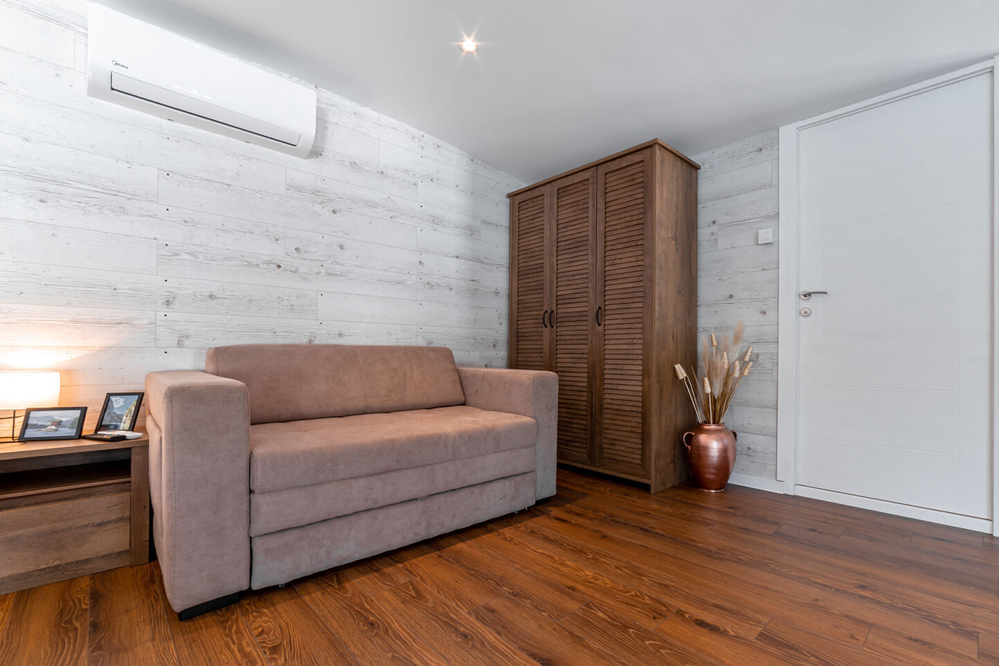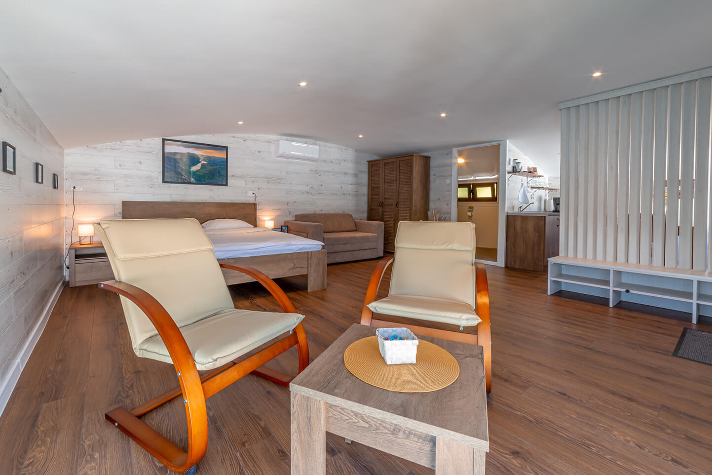 Apartman je tipa studio, ima francuski ležaj i dvosed na rasklapanje za boravak do 3 odrasle osobe ili porodicu sa dvoje ili troje dece.